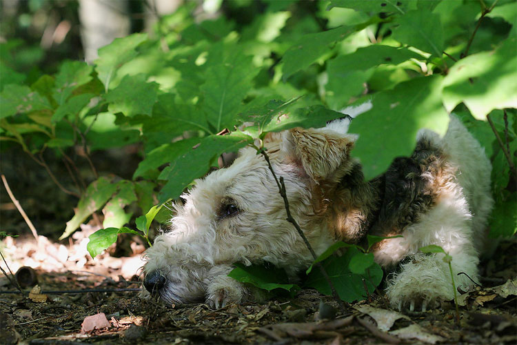 Mütze wartet geduldig, wenn Frauchen Pilze fotografiert Canon EOS 10D - Canon EF 100 mm f/2.8 Macro USM - f5.6 - 1/125 s - Iso 400 - Freihand 4. September 2004, Saarbrücken, Fischbachtal - Captive -